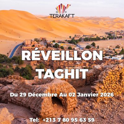 Fêtez le Réveillon 2026 dans l'atmosphère envoûtante de Taghit, surnommée "l'enchanteresse" du désert algérien. Ce lieu fascinant vous plonge dans un décor intemporel, avec son ksar historique, ses dunes majestueuses, ses maisons en terre rouge, et sa palmeraie verdoyante. Les gravures rupestres millénaires et l'hospitalité légendaire des habitants vous réservent une immersion authentique dans la culture saharienne.